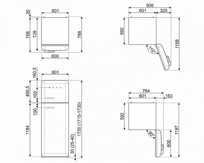 Ширина с дверцей, открытой на 90°С764 мм