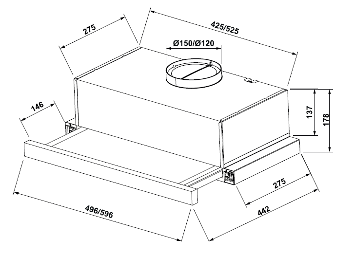 | Размеры вытяжки (ВхШхГ) | 178х596x275-442 мм |